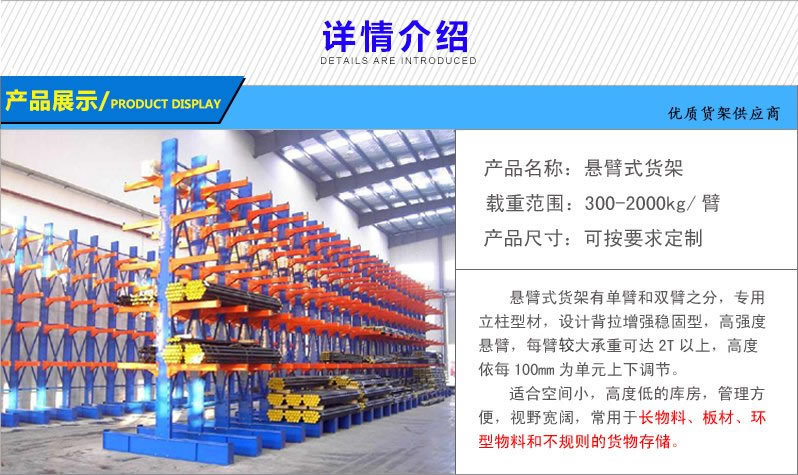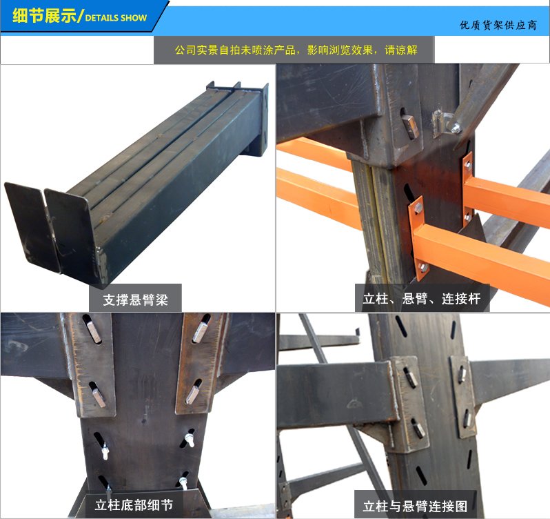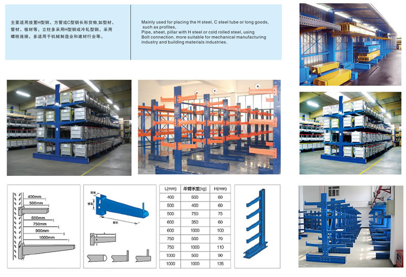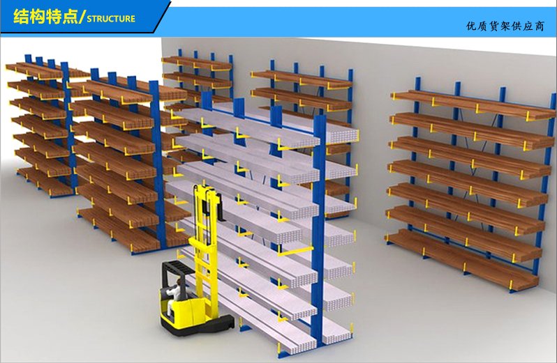 8、懸臂貨(huò)架並不是一個獨(dú)立(lì)的個體使用的貨架,可以(yǐ)由(yóu)多個立柱連接(jiē)來組(zǔ)成(chéng)一列(liè)貨架(jià)使(shǐ)用,這樣子每個貨架(jià)單元就可以分類(lèi)儲存不同類別的貨物,高效存儲木料、管材、長條物等類似產(chǎn)品。立柱上麵帶有由3-4個懸臂和縱梁相連組(zǔ)成可調試鉗位夾。