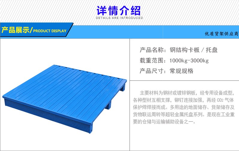 鋼托盤又叫(jiào)金屬托盤或鐵托盤(Steel Pallet)托盤(pán)(Pallet)是用於集裝、堆放、搬運和運(yùn)輸的放置作為單元負荷的貨物和(hé)製品(pǐn)的水平平(píng)台(tái)裝置。